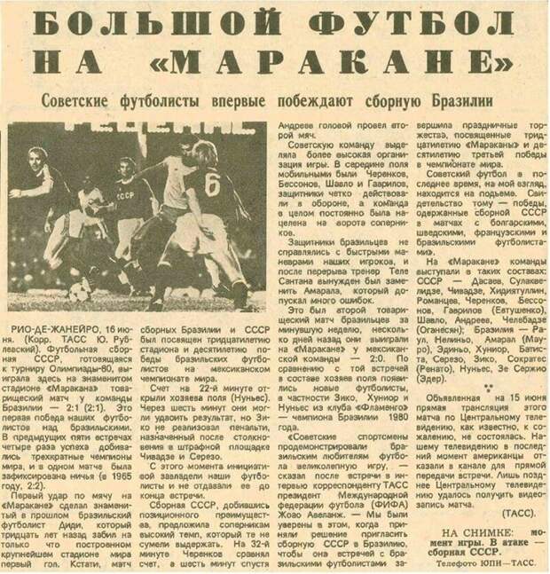 Почти 40 лет назад, 15 июня 1980 года, в товарищеском матче на стадионе «Маракана» сборная Бразилии принимала команду СССР. Встреча была приурочена к 30-летию легендарного стадиона, поэтому для местных болельщиков победа в нём была особенно важна, к тому же в тот год бразильцы праздновали десятилетний юбилей победы на ЧМ-1970.