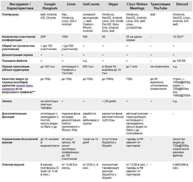 А еще — сделали небольшое сравнение основных платформ, куда включили Google Hangouts, Zoom, GetCourse, Skype, Cisco Webex Meetengs, Discord и прямые трансляции в YouTube.